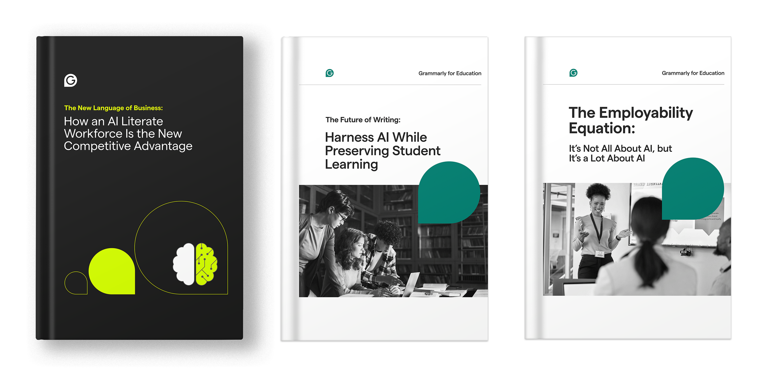 Grammarly Ebook Design Ebook 01 The New Language of Business: How an AI-Literate Workforce Is the New Competitive Advantage Ebook 02 The Future of Writing: Harness AI While Preserving Student Learning Ebook 03 The Employability Equation: It’s Not All About AI, but It’s a Lot About AI